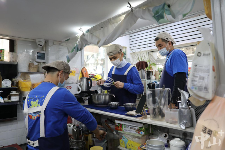 走进店内,几名年轻人各司其职,忙得不亦乐乎。两人对照手机教程准备制作蛋糕的材料,一人负责分离蛋清和蛋黄,一人专注搅拌面粉。经过搅拌、烘烤等一道道工序,约1小时后,几块热气腾腾的蛋糕新鲜出炉。一旁,身材高挑的男生志军正忙着准备午餐。“他们三个现在已经很熟练了,配合得特别好。”志军的妈妈笑着说道。